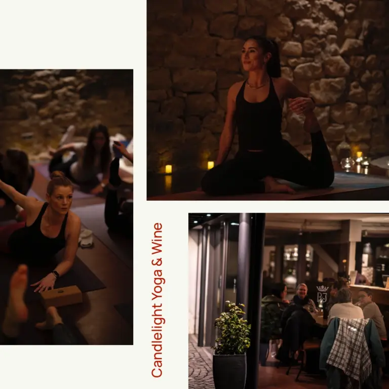Während der Yoga Session stand nicht die Inszenierung im Vordergrund, sondern das echte Erleben. Fließende Bewegungen, konzentrierte Gesichter, kleine Details im Kerzenlicht und das Zusammenspiel von Raum, Klang und Körperarbeit. Im Anschluss verlagerte sich das Geschehen in den historischen Gewölbekeller, wo die Weinverkostung und Kellerführung stattfanden. Auch hier ging es darum, Momente festzuhalten, ohne sie zu unterbrechen. Natürliche Begegnungen, entspannte Gespräche und der bewusste Genuss standen im Fokus.